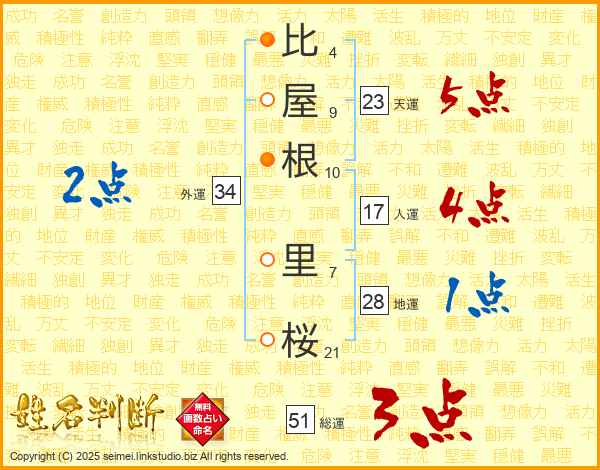 比(4画)屋(9画)根(10画) 里(7画)桜(21画)