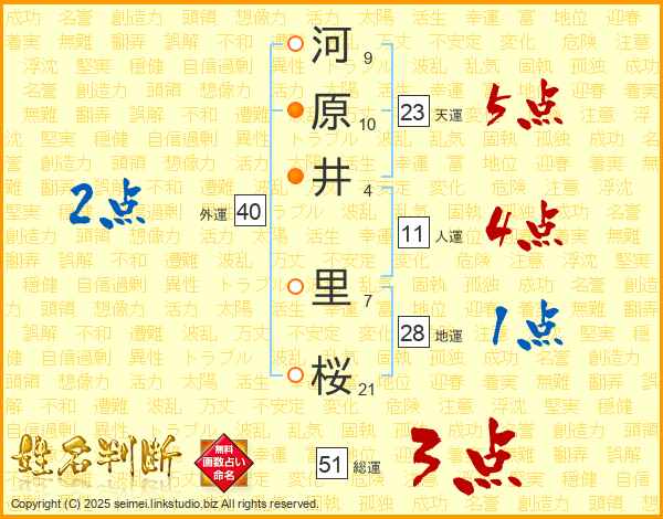 河(9画)原(10画)井(4画) 里(7画)桜(21画)