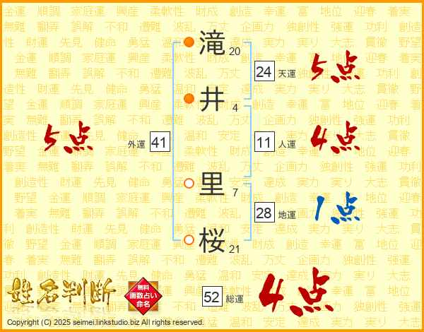 滝(20画)井(4画) 里(7画)桜(21画)