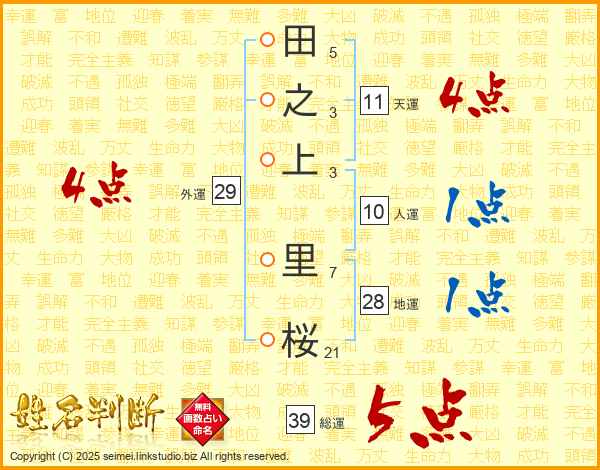 田(5画)之(3画)上(3画) 里(7画)桜(21画)