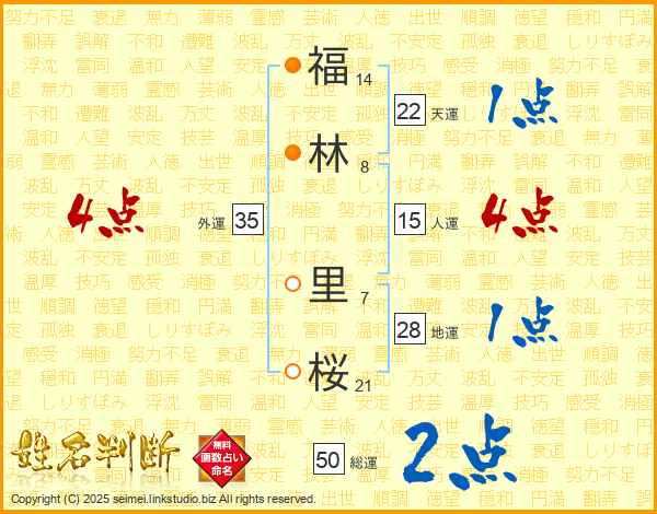 生活面を象徴する運勢です。外部から受ける影響力を表し、結婚運、家庭運や職場、環境への順応性を表します。総運から人運を引いた画数。姓や名が1文字の場合を除く。