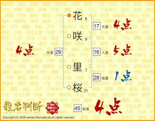 あなたの人生を表す1番重要な運勢です。生涯を通じて影響する総合運となり、主に50歳以降の晩年期に影響を及ぼします。苗字と名前の合計画数。