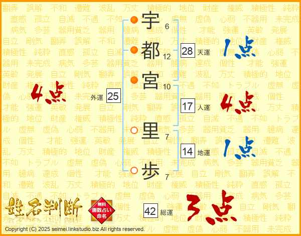 宇(6画)都(12画)宮(10画) 里(7画)歩(7画)