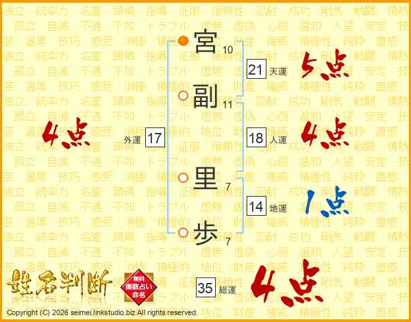 生活面を象徴する運勢です。外部から受ける影響力を表し、結婚運、家庭運や職場、環境への順応性を表します。総運から人運を引いた画数。姓や名が1文字の場合を除く。