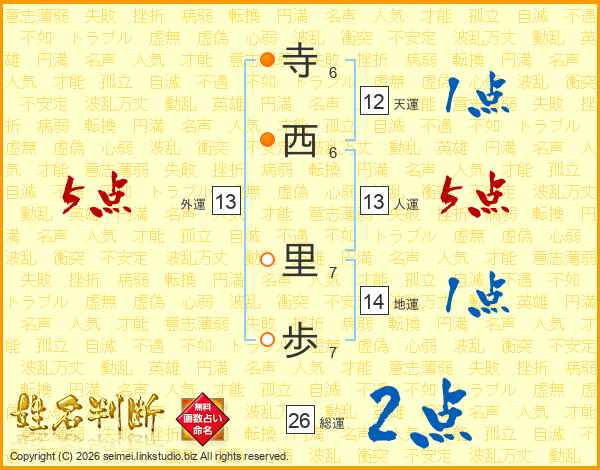 生活面を象徴する運勢です。外部から受ける影響力を表し、結婚運、家庭運や職場、環境への順応性を表します。総運から人運を引いた画数。姓や名が1文字の場合を除く。