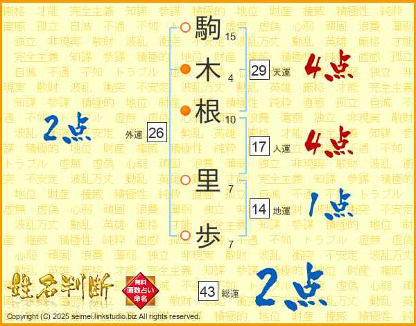駒(15画)木(4画)根(10画) 里(7画)歩(7画)