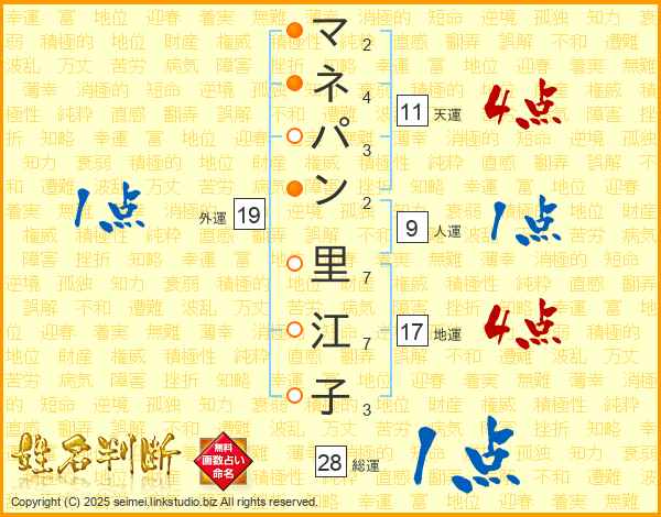 マ(2画)ネ(4画)パ(3画)ン(2画) 里(7画)江(7画)子(3画)