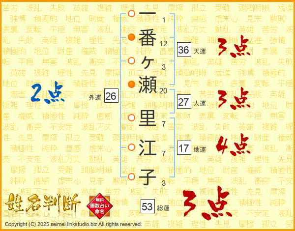 一番ヶ瀬里江子さんの総運は53画の3点!