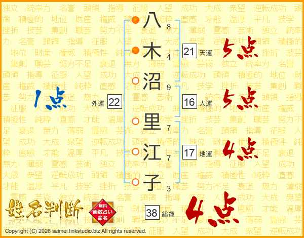 八木沼里江子さんの総運は38画の4点!