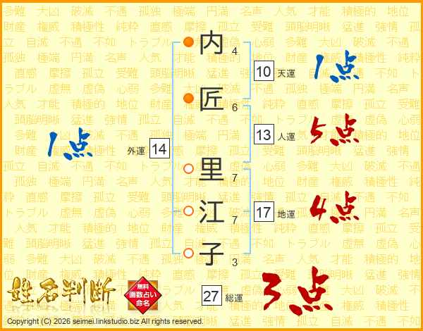 内(4画)匠(6画) 里(7画)江(7画)子(3画)