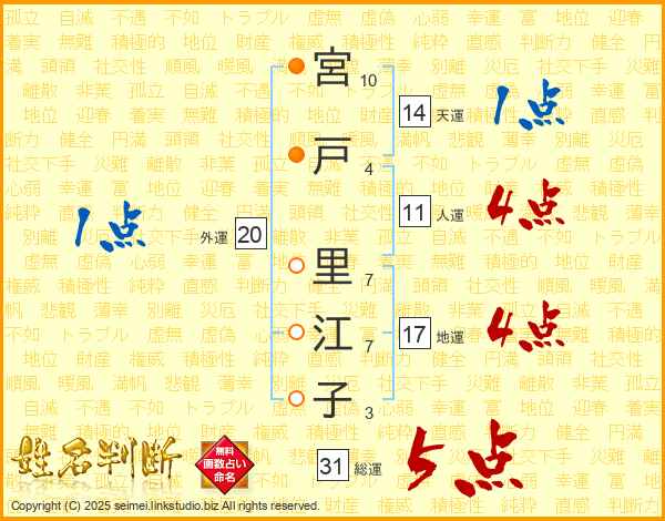 宮(10画)戸(4画) 里(7画)江(7画)子(3画)