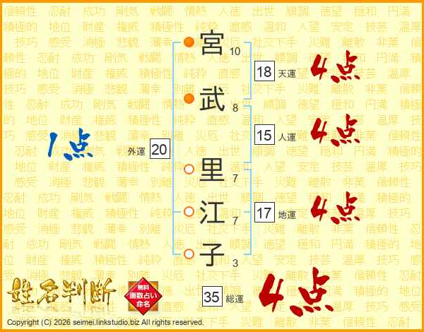 宮(10画)武(8画) 里(7画)江(7画)子(3画)