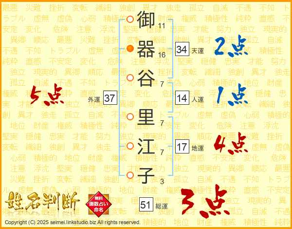 御(11画)器(16画)谷(7画) 里(7画)江(7画)子(3画)