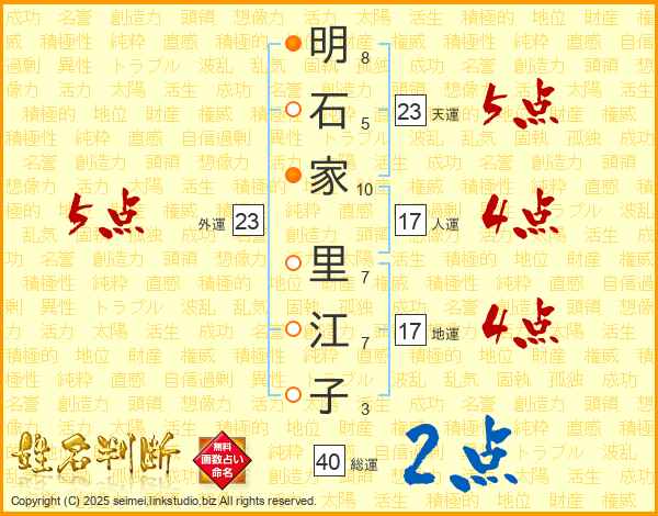 明(8画)石(5画)家(10画) 里(7画)江(7画)子(3画)