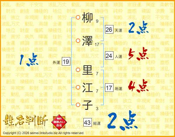 柳(9画)澤(17画) 里(7画)江(7画)子(3画)