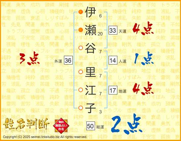 伊(6画)瀬(20画)谷(7画) 里(7画)江(7画)子(3画)