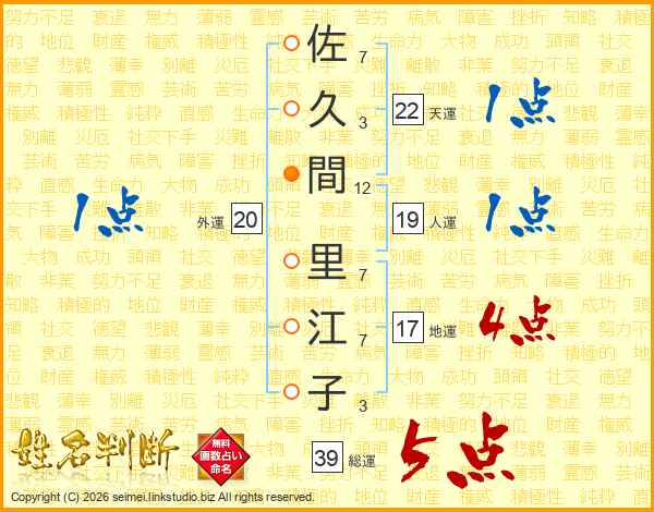 佐(7画)久(3画)間(12画) 里(7画)江(7画)子(3画)