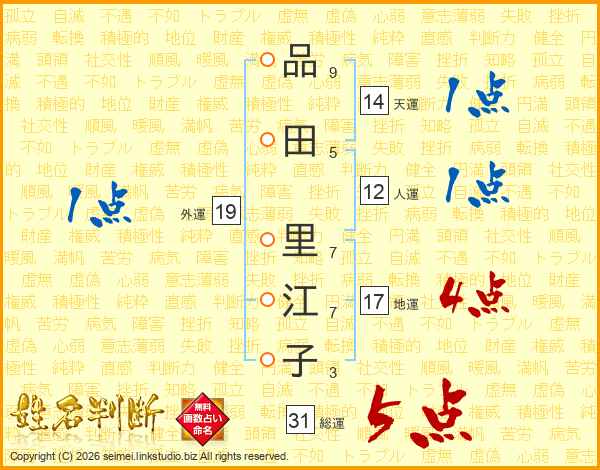 品(9画)田(5画) 里(7画)江(7画)子(3画)