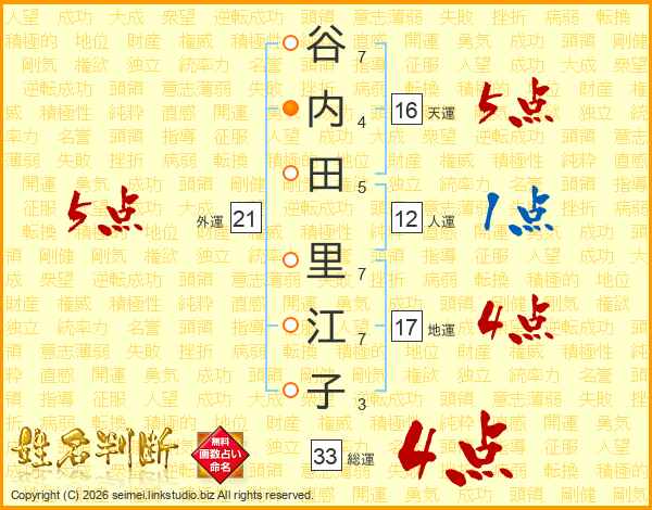 谷(7画)内(4画)田(5画) 里(7画)江(7画)子(3画)