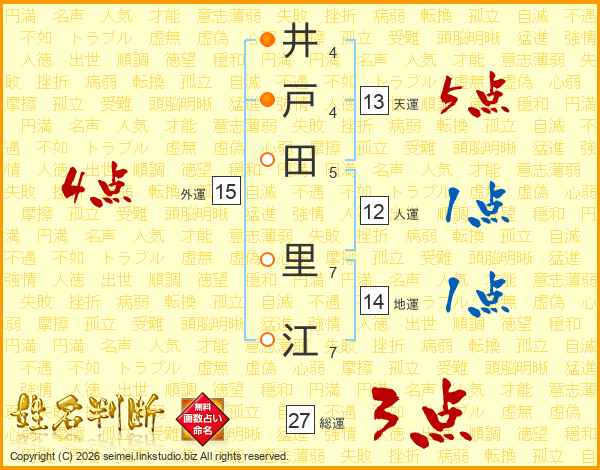 井(4画)戸(4画)田(5画) 里(7画)江(7画)