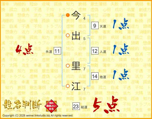 生活面を象徴する運勢です。外部から受ける影響力を表し、結婚運、家庭運や職場、環境への順応性を表します。総運から人運を引いた画数。姓や名が1文字の場合を除く。
