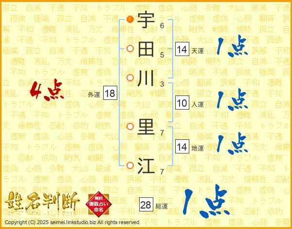 宇(6画)田(5画)川(3画) 里(7画)江(7画)