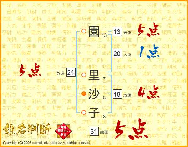 生活面を象徴する運勢です。外部から受ける影響力を表し、結婚運、家庭運や職場、環境への順応性を表します。総運から人運を引いた画数。姓や名が1文字の場合を除く。