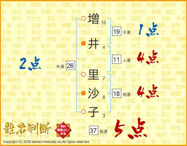 増(15画)井(4画) 里(7画)沙(8画)子(3画)