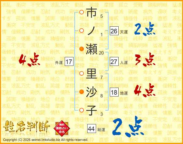 市(5画)ノ(1画)瀬(20画) 里(7画)沙(8画)子(3画)
