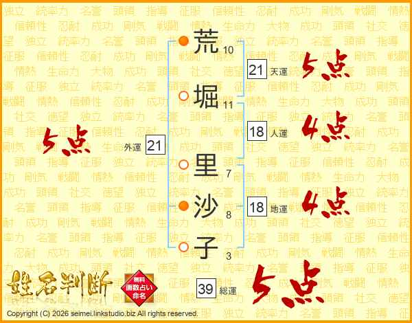 荒(10画)堀(11画) 里(7画)沙(8画)子(3画)