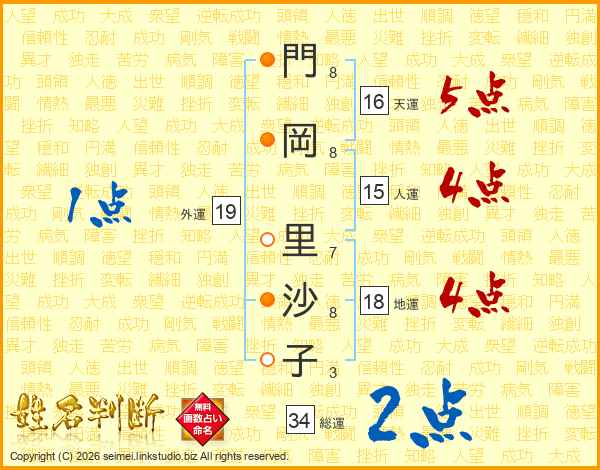 門(8画)岡(8画) 里(7画)沙(8画)子(3画)
