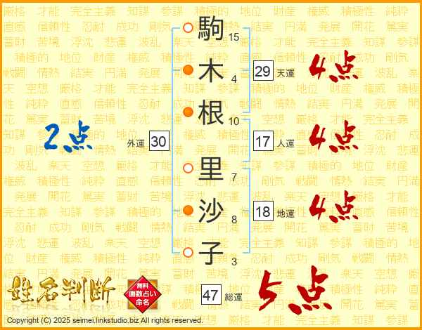駒(15画)木(4画)根(10画) 里(7画)沙(8画)子(3画)