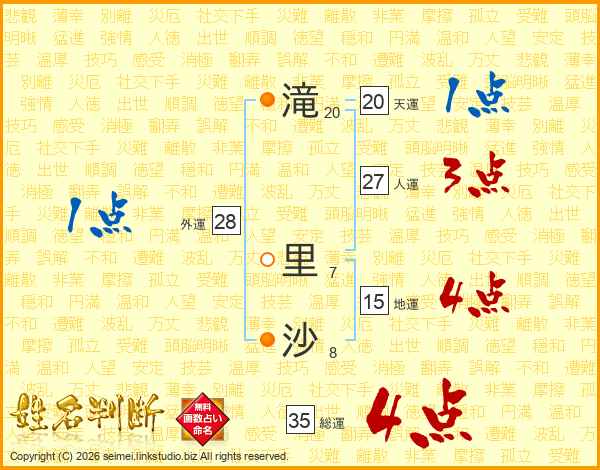 滝(20画) 里(7画)沙(8画)