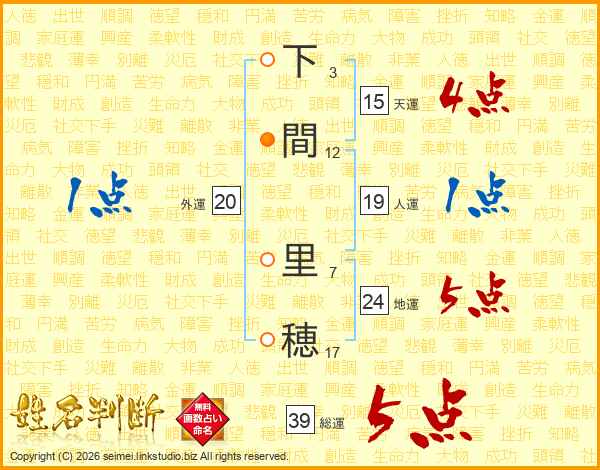 下間里穂さんの総運は39画の5点!