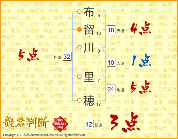 布(5画)留(10画)川(3画) 里(7画)穂(17画)