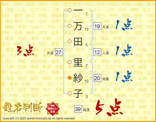 一(1画)万(13画)田(5画) 里(7画)紗(10画)子(3画)