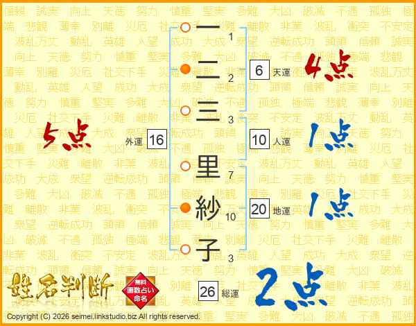 一(1画)二(2画)三(3画) 里(7画)紗(10画)子(3画)