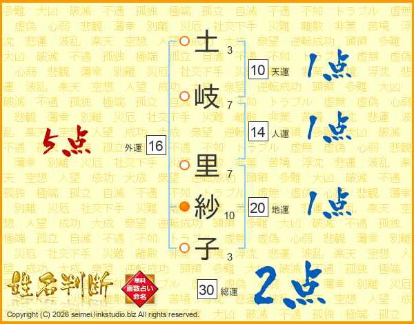 土(3画)岐(7画) 里(7画)紗(10画)子(3画)