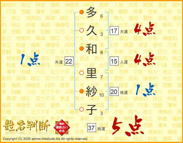 多久和里紗子さんの総運は37画の5点!