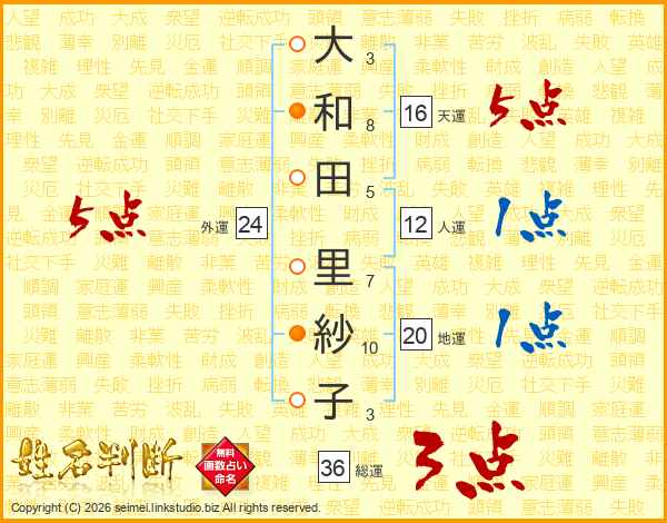 大(3画)和(8画)田(5画) 里(7画)紗(10画)子(3画)