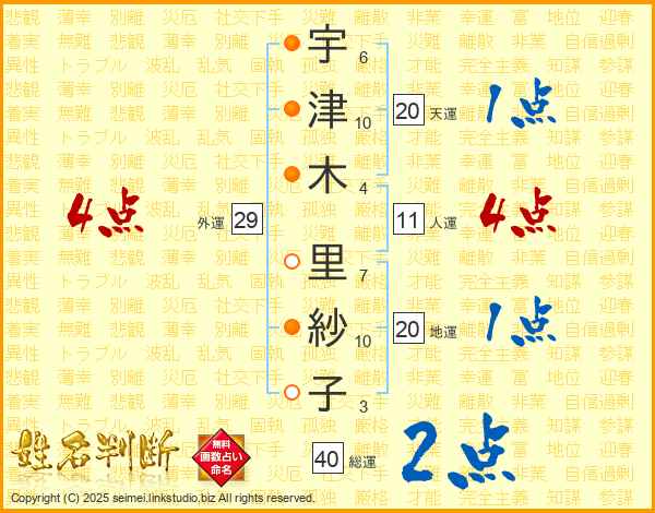 宇(6画)津(10画)木(4画) 里(7画)紗(10画)子(3画)