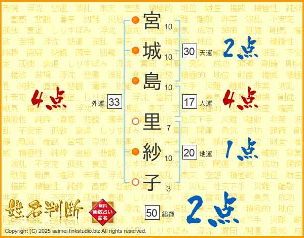 宮(10画)城(10画)島(10画) 里(7画)紗(10画)子(3画)