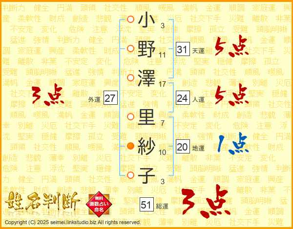 小(3画)野(11画)澤(17画) 里(7画)紗(10画)子(3画)