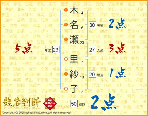 木(4画)名(6画)瀬(20画) 里(7画)紗(10画)子(3画)