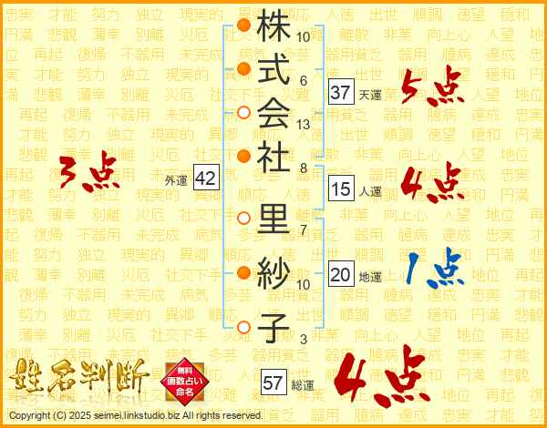 株(10画)式(6画)会(13画)社(8画) 里(7画)紗(10画)子(3画)