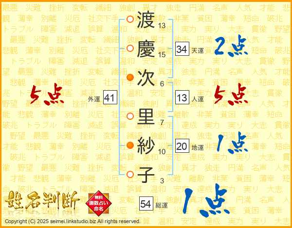 渡(13画)慶(15画)次(6画) 里(7画)紗(10画)子(3画)