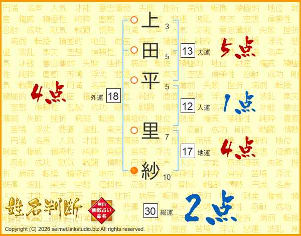 上(3画)田(5画)平(5画) 里(7画)紗(10画)