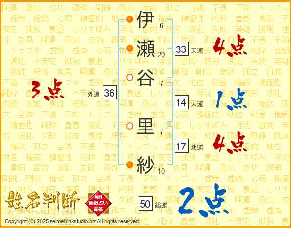 伊(6画)瀬(20画)谷(7画) 里(7画)紗(10画)