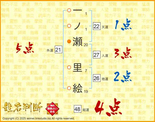 一(1画)ノ(1画)瀬(20画) 里(7画)絵(19画)