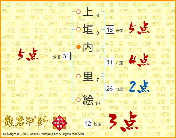 上(3画)垣(9画)内(4画) 里(7画)絵(19画)
